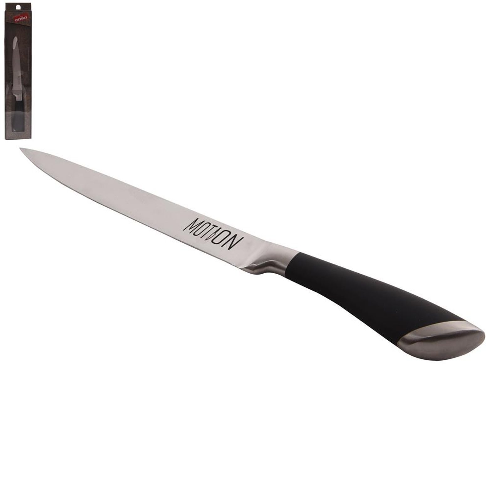 Nůž kuchyňský v zajímavém provedení. Rukojeť skvěle padne do ruky. Krájení je snadné, přesné. Materiál: nerezová ocel, plast. Rozměry: celková délka nože 33,5 cm, čepel 20 cm.