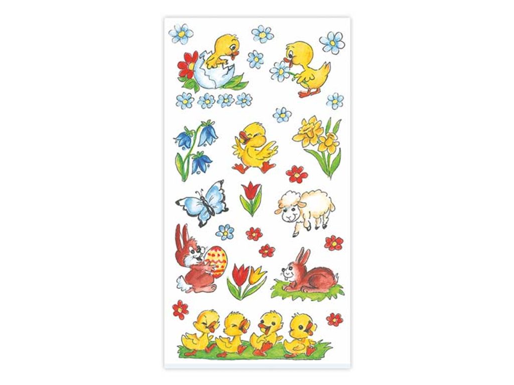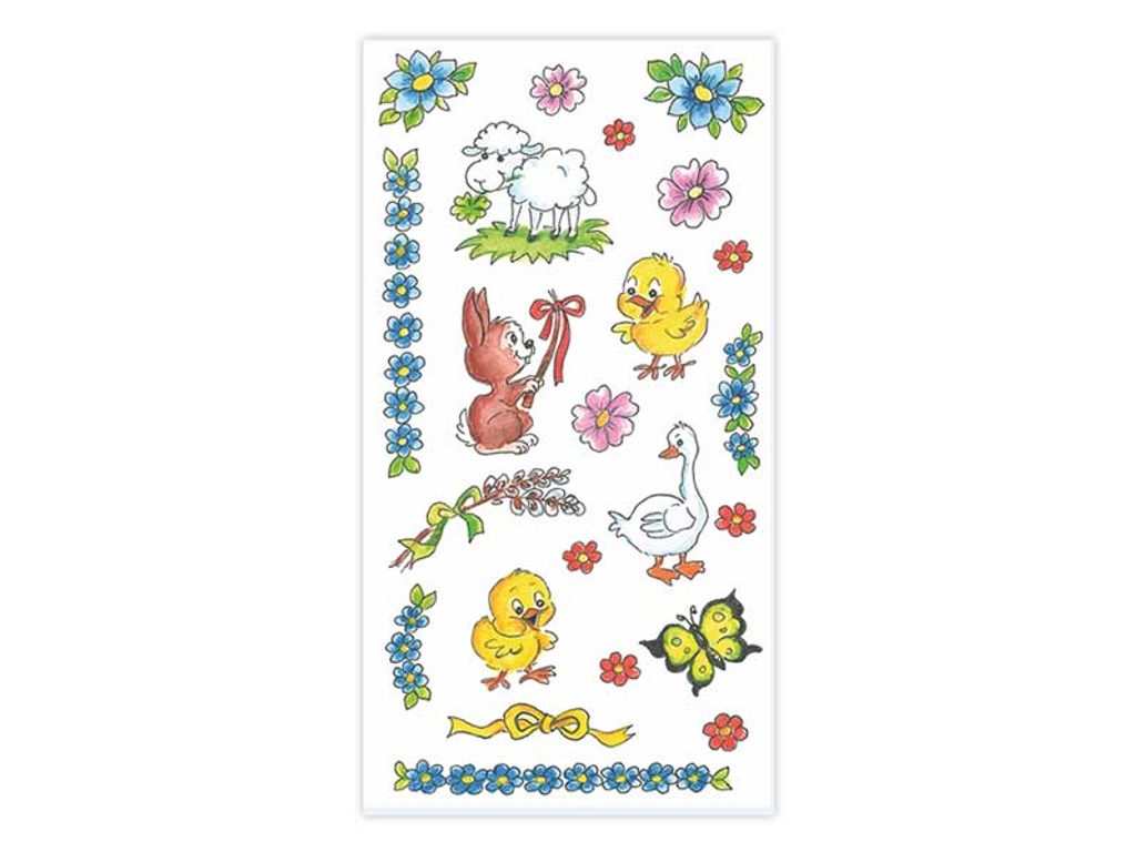 Samolepky na velikonoční vajíčka s tradiční motivy beránků, kuřátek, zajíčků, a dalších symbolů velikonoc a jara. Jak nalepit samolepku na vejce: 1. K dekorování použijte čisté, odmaštěné a suché vejce. 2. Odstraňte krycí papír. Opatrně sloupněte vybraný obrázek z podkladové fólie. 3. Lepící stranou přiložte obrázek na vejce a prstem uhlaďte. Dodáváme v mixu po 4 ks dle skladové zásoby. Cena za 1 aršík.